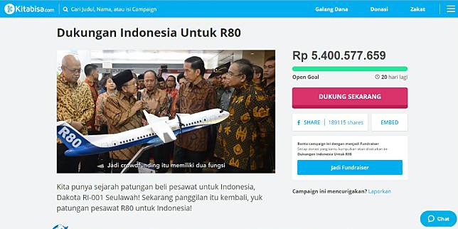 Menurut laman tersebut, masyarakat Indonesia sangat ingin memiliki pesawat buatan dalam negeri. Buktinya, sebaran kampanye R80 di Facebook yang mencapai 189.503 kali.