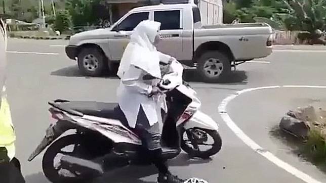 Remaja berjilbab putih itu langsung menaiki motornya.